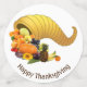 Hermoso cuerno de la abundancia con calabaza, frutas y hojas de otoño sobre confeti de mesa blanca