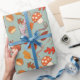 "Hojas de otoño y hongos Papel de envolver sin foco" muestra ardillas reuniendo castañas y setas entre hojas coloridas, añadiendo un toque alegre y festivo a tus regalos de temporada.