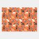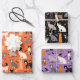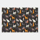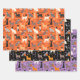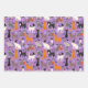 El gato blanco, el gato negro, el gato manchado, el gato persa, el gato siamés y el gato esmoquin llevan gorras de brujas y disfraces de Halloween con murciélagos dispersos y huellas de pata.