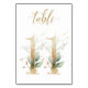Tarjeta de número de mesa con un motivo botánico - una ilustración de acuarela de hojas verdes y doradas. Mesa 11. Por favor, revise todos los números disponibles