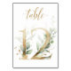 Tarjeta de número de mesa con un motivo botánico - una ilustración de acuarela de hojas verdes y doradas. Mesa 12. Por favor, revise todos los números disponibles