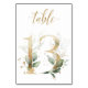 Tarjeta de número de mesa con un motivo botánico - una ilustración de acuarela de hojas verdes y doradas. Mesa 13. Por favor, revise todos los números disponibles