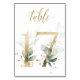 Tarjeta de número de mesa con un motivo botánico - una ilustración de acuarela de hojas verdes y doradas. Mesa 17. Por favor, revise todos los números disponibles
