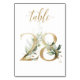 Tarjeta de número de mesa con un motivo botánico - una ilustración de acuarela de hojas verdes y doradas. Mesa 28. Por favor, revise todos los números disponibles