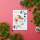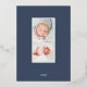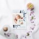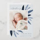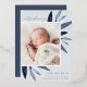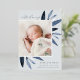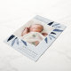 El elegante anuncio de nacimiento presenta una única foto vertical/retrato adornada con delicadas hojas de color azul y acentos de Relieve metalizado plateado. Personalice el nombre, la fecha de nacimiento, las estadísticas y la firma familiar de su bebé. Añade dos fotos cuadradas adicionales a la parte posterior.