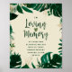 Cartel de recuerdo de boda personalizado con borde de follaje tropical de moda y hojas Verdes. Perfecto para la decoración de su recepción o fiesta, para recordar a los seres queridos perdidos. En una paleta de colores audaces de ricos verdes, esmeralda y con apariencia de lámina de oro. Este diseño es perfecto para una boda en la playa, de destino o de verano. Con sentimientos de un paraíso tropical, este diseño de hojas de palma vívidas complementará su lugar de celebración de boda en la playa o tropical. En un esquema de color verde oscuro, azul verdoso, esmeralda, follaje y oro - Señal de recuerdo de la recepción de boda en memoria amorosa.