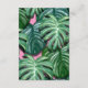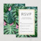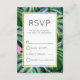 Una simple tarjeta de respuesta de boda con un fondo pintado que presenta hojas tropicales pintadas en verde. Un marco blanco superpuesto con un borde de falso foil dorado.
