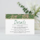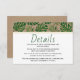 Las hojas tropicales verde y dorado detalles boda insertar tarjeta. Diseño de bonito que muestra hojas de Split Leaf Philodendron (Monstera deliciosa) o de planta de queso suizo y hojas de palma en rosa rubí con contorno dorado sobre papel estilo kraft. La parte trasera está cubierta con un patrón de puntos de polka dorado en papel estilo cartón. Elige para tu playa tropical costera o tu boda de destino.