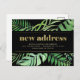 Esta tarjeta postal de cambio de dirección tropical de moda presenta un marco de monstera moderna y otras hojas tropicales verdes con líneas de falso oro sobre un fondo oscuro y negro. Las palabras "nueva dirección" aparecen en tipografía de falso oro trendy y contemporánea. Un anuncio de mudanza simple pero elegante que estarás orgulloso de enviar a amigos y familiares.