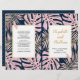 Focas tropicales rosas y doradas, ceremonia de boda azul marino y programa plegado fiesta. El diseño de este bonito se compone de hojas de Split Leaf Philodendron (Monstera deliciosa) o de hojas de queso suizas y hojas de palma de color rosa rubor con contorno dorado sobre fondo azul marino. Su redacción está en un marco blanco con un contorno dorado. Elige para tu playa tropical costera o tu boda de destino. Doblarlo en el centro para tener un programa de bodas de estilo plegado.