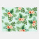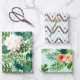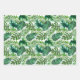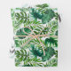 Hojas de papel de envoltura moderna con hojas tropicales y patrones geométricos.