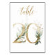 Tarjeta de número de mesa con un motivo botánico - una ilustración de acuarela de hojas verdes y doradas. Mesa 20. Por favor, revise todos los números disponibles