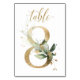 Tarjeta de número de mesa hermosa con un motivo botánico - una ilustración de acuarela de hojas verdes y doradas. Mesa 8. Por favor, revise todos los números disponibles