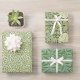 Las tres hojas de papel de envolver tienen patrones vintage de Morris de William Morris (1834 - 1896) y John Henry Dearle (1860-1932), todos ellos compuestos principalmente por hojas verdes. La primera, "Roble", tiene hojas de roble y bellotas en verde sobre fondo blanco, la segunda, "Pimpinela" (1876) tiene flores blancas y hojas, la tercera tiene ramas de sauce con hojas verdes sobre un fondo de cielo oscuro azul nocturno. Todos ellos son de dominio público.
