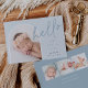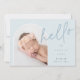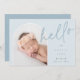 Elegante diseño de anuncio de nacimiento fotográfico con un diseño único, esta tarjeta de moda presenta una foto vertical en forma de arco sobre un suave fondo azul polvoriento, con "hola" puesto en la tipografía de escritura con letras a mano. Personalice con el nombre de su recién nacido, fecha de nacimiento y estadísticas de nacimiento, y añada un mensaje personal a la parte posterior, junto con tres fotos cuadradas adicionales.