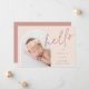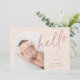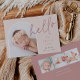 Elegante diseño de anuncio de nacimiento fotográfico con un diseño único, esta tarjeta de moda presenta una foto vertical en forma de arco sobre un suave fondo rosa rosa polvoriento, con "hola" puesto en la tipografía de escritura con letras a mano. Personalice con el nombre de su recién nacido, fecha de nacimiento y estadísticas de nacimiento, y añada un mensaje personal a la parte posterior, junto con tres fotos cuadradas adicionales.