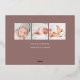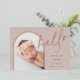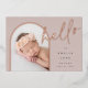 Elegante diseño de anuncio de nacimiento fotográfico con un diseño único, esta tarjeta de moda presenta una foto vertical en forma de arco sobre un suave fondo de tono de tierra neutro, con "hola" en tipografía de escritura con letras de Relieve metalizado oro subió. Personalice con el nombre de su recién nacido, fecha de nacimiento y estadísticas de nacimiento, y añada un mensaje personal a la parte posterior, junto con tres fotos cuadradas adicionales.