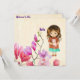 texto de saludo personalizado y un lindo chica sosteniendo al gato con flores de corona rosa y violeta.