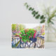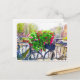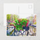 Esta postal presenta una escena desde lo alto de un puente en Ámsterdam, con flores brillantes y hermosas, y bicicletas, que están aparcadas a lo largo del borde. Se pueden ver edificios al fondo.