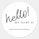 Simple pegatina de nombres en blanco y negro con un guión casual que dice "¡hola! MI NOMBRE ES". Úsalo para reuniones sociales y fiestas.