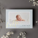 Un diseño de anuncio de nacimiento neutro, dulce y elegante, con una foto horizontal o orientada al paisaje de sangrado completo bordeada de blanco, con "hola" en la parte inferior izquierda con letras manuscritas de Relieve metalizado dorado. El nombre de su bebé, las estadísticas de nacimiento y un mensaje personal aparecen en la parte inferior derecha. Añade tres fotos cuadradas adicionales a la parte posterior.