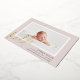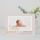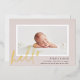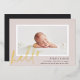 Un diseño de anuncio de nacimiento neutro, dulce y elegante, con una foto horizontal o orientada al paisaje de sangrado completo bordeada de blanco, con "hola" en la parte inferior izquierda con letras manuscritas de Relieve metalizado dorado. El nombre de su bebé, las estadísticas de nacimiento y un mensaje personal aparecen en la parte inferior derecha. Añade tres fotos cuadradas adicionales a la parte posterior.