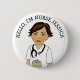 Preséntese a sus pacientes o clientes con este botón de fácil lectura. Dibujo personalizado de una enfermera de morena caucásica con gafas, fisioterapeuta o cuidadora con matorrales azules. ¡Escríbeme aquí a través de Zazzle si quieres que haga una a tu gusto!