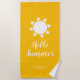 Hola, toalla de playa de color amarillo veraniego con un nombre personalizado. Toallas de playa personalizadas con tipografía de escritura de pincel elegante e icono soleado. Añade tu propia cita graciosa, nombre o letras de monograma. Cuta idea de regalo de cumpleaños para esposa, chica, novia, hija, amiga, tía, abuela, hermana, mamá, novia boda, dama de honor, jefa, jubilada, pareja, etc. Accesorios de verano divertidos para la playa y la piscina. Elegante diseño de letras a mano con color de fondo azul turquesa de personalizable. Regalos de lujo para ella. También es genial para recién casados.