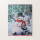 Parece que todos han venido a unirse a la fiesta de Navidad con el muñeco de nieve. Un puzzle delicioso para juntar con la familia. Imagen de mi arte original.