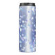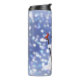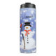 Feliz muñeco de nieve, tumblers térmicos para bebidas calientes, Chocolate caliente mientras juegan afuera en la nieve.