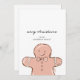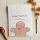Esta tarjeta de vacaciones presenta un diseño minimalista con un tema juguetón y alegre. La ilustración central es una figura de pan de jengibre de color marrón claro, delineada con líneas negras suaves y decorada con detalles de glaseado blanco, incluyendo botones, una corbata de lazo y patrones en los brazos. El fondo es limpio y blanco, creando una apariencia simple y elegante. El diseño se centra en el encanto festivo mientras mantiene una estética moderna y sin desorden.