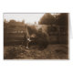 Hombre Millando Vaca en el Barnyard y alimentando la tarjeta de saludo de gato.