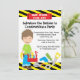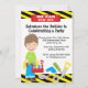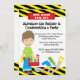 Empieza tu celebración con esta adorable solución que invita. ¡Perfecto para ese práctico niño cumpleaños! Tiene un borde de rayas diagonales amarillas y negras en la parte superior e inferior. Hay un cartel rojo que dice "Podemos arreglarlo". Hay un chico con el pelo castaño sosteniendo una caja de herramientas roja. Hay herramientas como: taladro, sierra, alicates, destornillador, y un tornillo en la parte inferior de la invitación. Mira los muchos otros diseños de esta línea. ©babystar