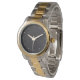 Este moderno reloj de pulsera de dos tonos masculinos es un accesorio elegante que complementará cualquier conjunto. Debido a la longevidad y a la calidad de los materiales, es perfecto tanto para eventos formales como para el uso diario.