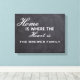 Una impresión personalizada de lona estirada que muestra el apellido de la familia escrito en un fondo de pizarra texturizada junto con el texto "El hogar es donde está el corazón". Esta impresión de lona personalizado es un gran regalo para cualquier ocasión.
