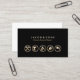 Esta casa y la tarjeta de visita general de reparación cuentan con un fondo negro de chorro. En la mitad inferior de la tarjeta aparecen cinco iconos dorados relacionados con las reparaciones de la casa, con el nombre de su empresa y el eslogan o el texto en negrita en la mitad superior. Los datos de contacto aparecen en la parte posterior de la tarjeta. Los pequeños iconos crean un aspecto profesional muy impresionante.