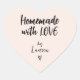 HOMEMADE en forma de corazón personalizado con AMOR en escritura moderna sobre fondo rosa pálido. Agrega un toque de acabado de bonito para todos tus regalos hechos a mano.