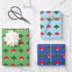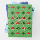 Patrón de hongos personalizados festivos. Uno tiene una gorra como un árbol de Navidad y el otro tiene una gorra como un sombrero de Santa. Cada hoja tiene un color de fondo diferente: verde claro, azul hielo y azul oscuro.