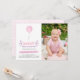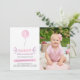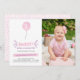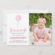 Esta encantadora invitación de cumpleaños es perfecta para un primer cumpleaños (o incluso para cualquiera después de eso). Elementos como un lindo globo rosado, textos modernos que dicen "HOORAY" y retornos pop fiesta morado se hacen en acuarela. ¡Fácil de personalizar con su propia foto e información fiesta! Simple y muy dulce! La parte posterior de la tarjeta contiene puntos de color rosa pálido.