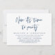 Tarjeta de invitación de boda con tema de escritura en azul marino moderno (Ahora es hora de fiesta). Es perfecta para su cena de boda informal a orillas del lago, baile y fiesta.