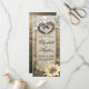 Rústico estilo de campo Boda Programa de Rústica Cartas para rack - Pareja Corazón de herradura vieja con nudo de abatimiento y encaje blanco, girasol, luces de cuerdas y tela de arpillera sobre fondo de madera de antiguo granero. Un diseño perfecto para tu gran día. ¡Todo el estilo de texto, colores, tamaños se pueden modificar para adaptarlo a sus necesidades!