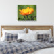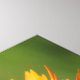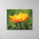 La flor de caléndula naranja se abre al cielo. Hojas verdes difusadas en el fondo. Los derechos de autor de los artistas en el extremo inferior.
