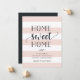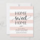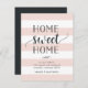 Invitaciones encantadoras y modernas que permiten a amigos y familiares conocer su nuevo hogar dulce hogar! El diseño presenta un sutil fondo rayado en rosa pastel y blanco, con "hogar dulce hogar" en escritura suave en negro y tipografía en bloques. Utilice los campos de plantilla para agregar la introducción del personalizado, la nueva dirección y los nombres.