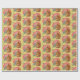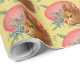 Papel envuelto con huevos rosados de Pascua, conejito y flores azules en un fondo amarillo.