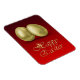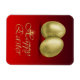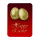 Ilustracion glamuroso con 2 huevos de pascua dorados sobre un fondo rojo.