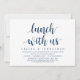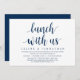 Guión moderno en tema de azul marino clásico, tarjeta de invitación de huida de boda (Almuerzo con nosotros, Los recién casados). Es perfecto para su celebración de huida de boda casual junto al lago.