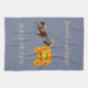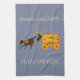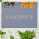 La humilde toalla de cocina de Halloween con la cabeza de calabaza y de caballo, con las palabras "humilde y feliz" encima y "HALLOWEEN" en el fondo de la toalla, el arte está inspirado en la Grúa de Ichabod y el Caballo sin Cabeza de Disney, solamente el caballo y el conductor, un jinete con cabeza de calabaza, son humildes mientras conducen un auto calabaza. Arte de Kristie Hubler