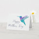 Esta tarjeta de saludo incluye un ilustracion de colibrí azul y púrpura con Relieve metalizado real de plata o oro y las palabras Feliz Día de la Madre en el frente y el saludo interior "Gracias por ser la mamá más asombrosa", que se pueden cambiar o retirar.