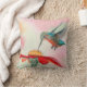 Un colibrí vibrante se cierne delicadamente sobre una flor roja brillante, bebiendo néctar con su pico delgado. El fondo suave y borroso en tonos rosa y verde realza la atención sobre los detalles complicados del ave y los pétalos vivos de la flor.