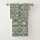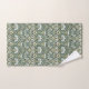 Hyacinth Flores al estilo de William Morris, tonos verdes y azules mudos con flores blancas, diseño simétrico, patrones repetitivos, fondo estampado, motivos florales de hojas verdes.